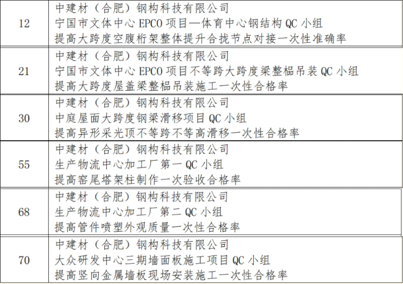 本次競賽旨在深入貫徹落實《質量強國建設綱要》精神,引導鋼木建筑行業企業科學運用先進質量管理方法,全面提升工程質量管理水平。全國各地眾多鋼木建筑企業踴躍參賽,競爭異常激烈。公司高度重視此次競賽,精心組織內部質量管理小組進行成果申報。最終,公司多個質量管理小組的項目成果在一眾參賽作品中成功突圍。其中,合肥經開區云海路產業園項目QC小組的“提高 PC 梁與鋼筋桁架樓承板連接安裝一次性合格率”課題榮獲二等獎。該成果聚焦鋼桁梁底部作業難題,通過技術創新,大幅提高了施工效率與安全性,為業內同類工程提供了極具價值的實踐范例。此外,中建材鋼構公司還有6項成果榮獲三等獎,獲獎成果覆蓋鋼結構制造、安裝以及施工工藝優化等多個領域,均是公司質量管理小組在實際工程項目中,運用科學方法,深耕技術創新與質量改進工作的結晶。